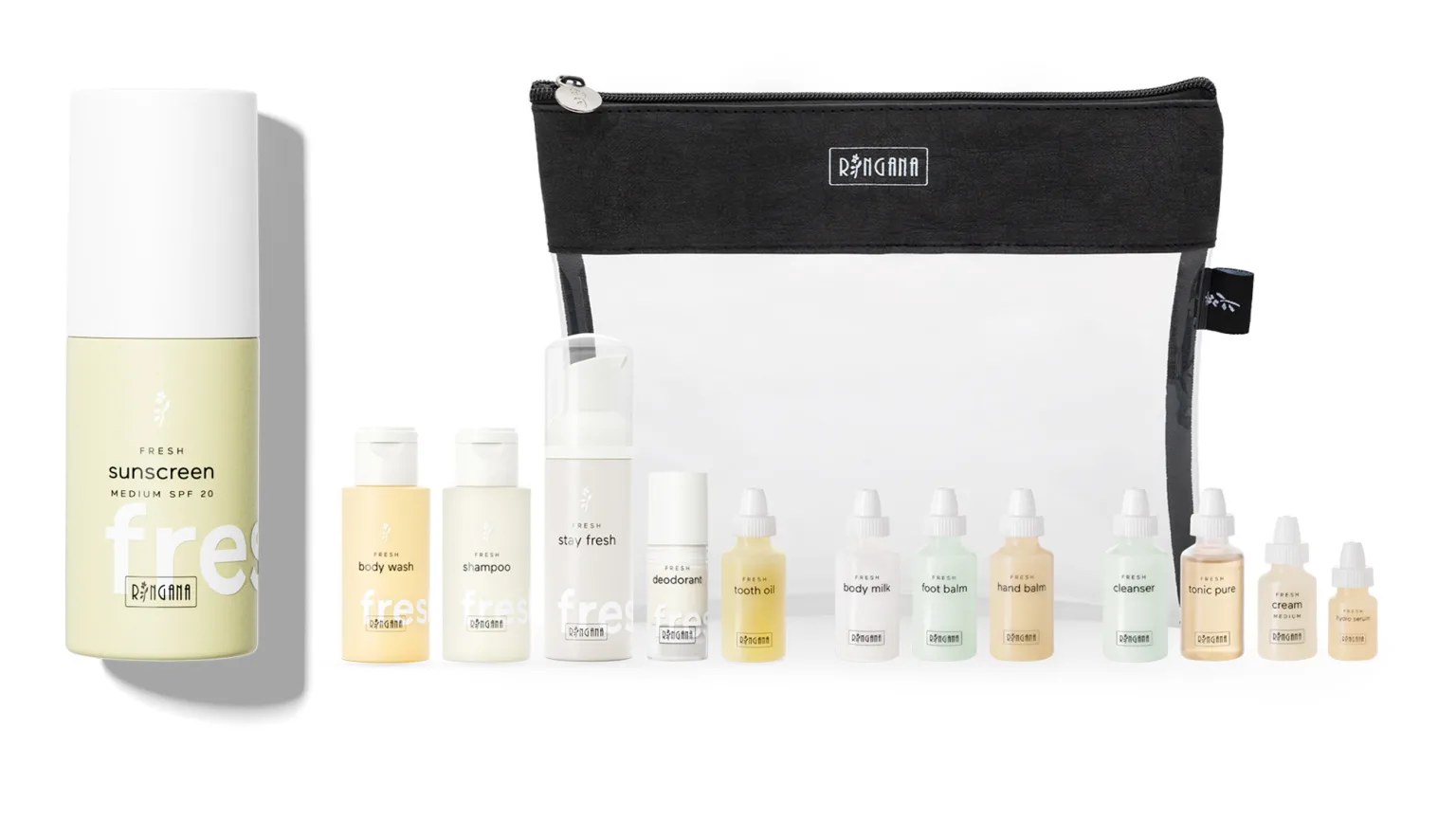 Designed to comply with cabin baggage restrictions, each set comes in a handy, transparent RINGANA travel bag made of recycled PET. The travel set includes FRESH products such as shampoo, body wash, deodorant, tooth oil, rejuvenating hydro serum and cleansing toners designed to create a holistic and satisfying grooming routine.
