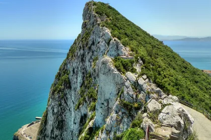 The Rock of Gibraltar is a monolithic limestone promontory, the upper area of which is mostly covered by a protected nature reserve.