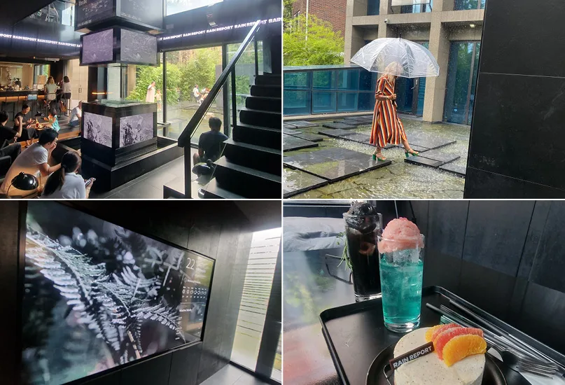 Gentle rain cascades every 15 minutes in the inner courtyard, enticing patrons to traverse the damp stepping stones cautiously, clutching one of the plastic umbrellas provided, where guests can seize the opportunity to capture a fun photograph amidst the ephemeral drizzle.