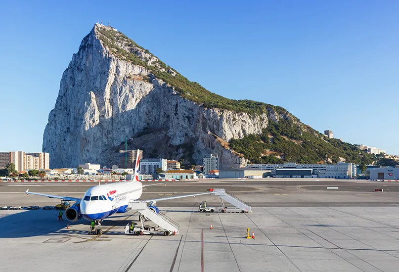 Flights arrive at Gibraltar International Airport (GIB), where visitors can safely cross the runway on a direct pathway into the nearby city centre.
